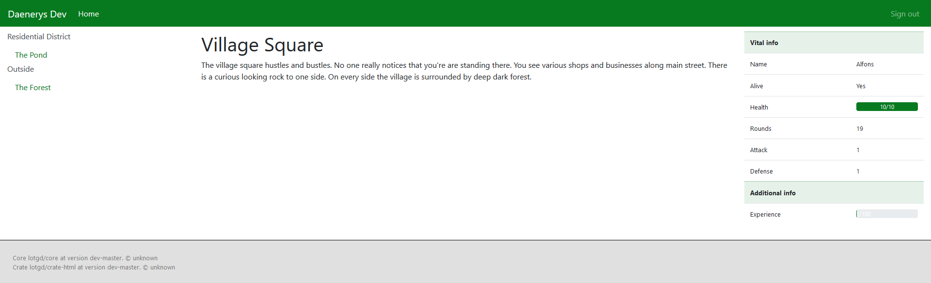 Gleichzeitig habe ich den neuen clienten (crate-html) in Version 0.5.0 veröffentlicht, der folgende Features hat: Benutzer erstellen (wie Passwort), Charaktere erstellen (bislang unlimitiert), und die Szenenabfolge funktioniert mit allen Modulen (durch das Dorf gehen, im Wald kämpfen, Erfahrung sammeln, heilen, sterben). Zur Zeit scheint es noch einen kleinen Bug im Wald zu geben wenn man gewinnt, da muss ich mal nachschauen, was da passiert.